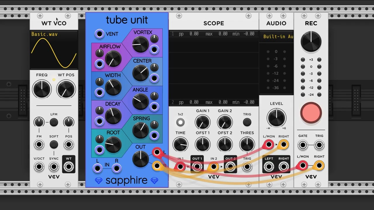 Tube Unit is a tubular waveguide simulation that makes highly modulatable drone sounds. It’s fun to feed into either of the next two modules!