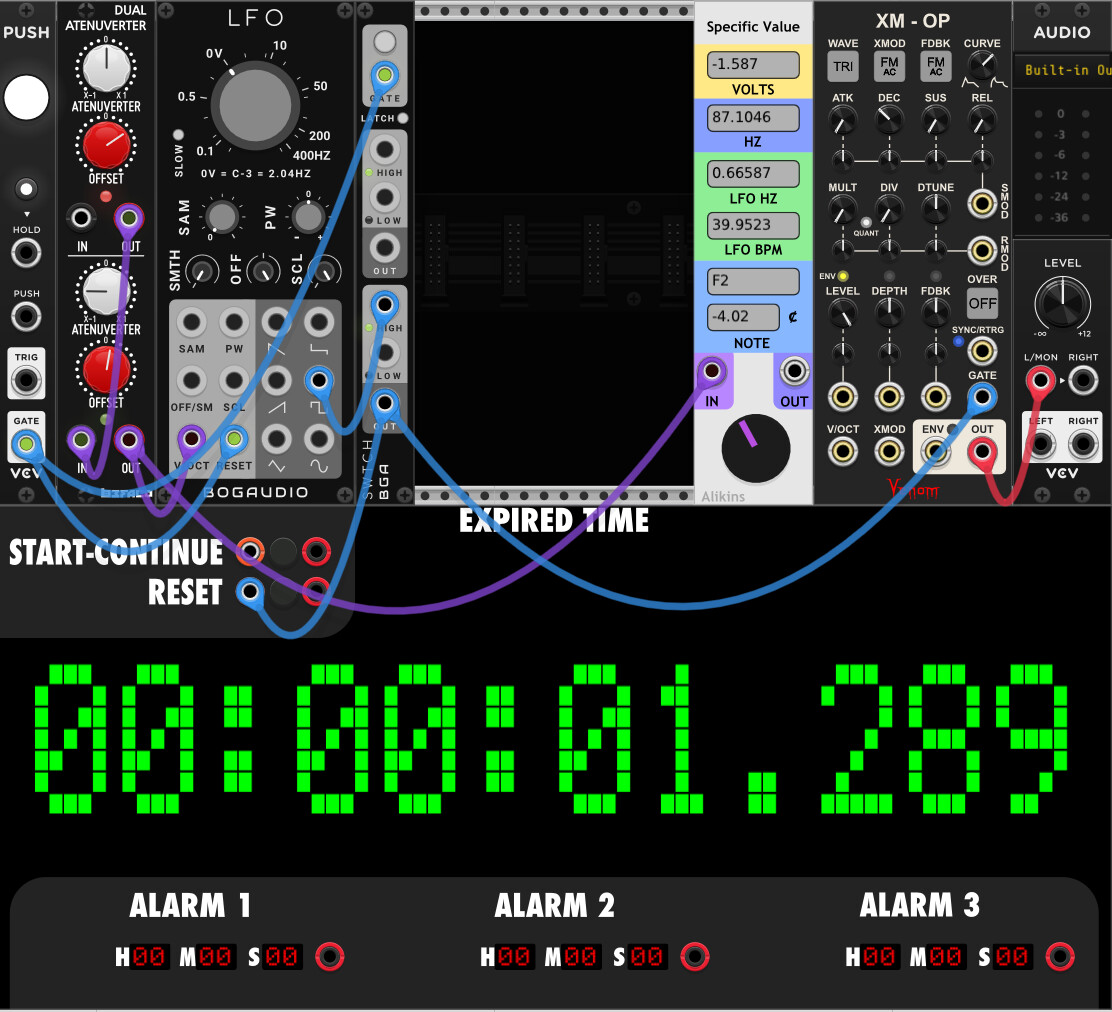 Note that since the normal clocks cannot go to the extreme range you’re after, we instead need to use an LFO that can just about be pushed to do it. Those don’t have start/stop buttons so instead we need to emulate that with a latching switch.