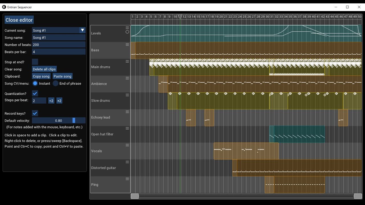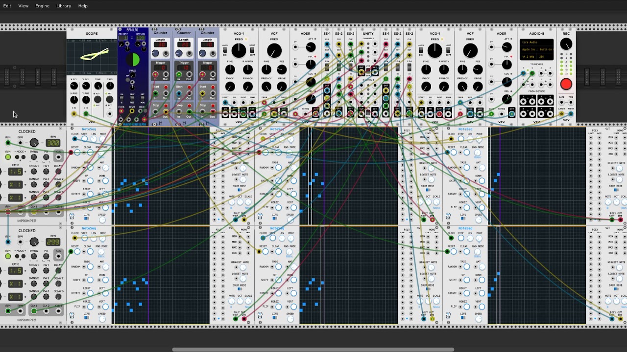 …or here’s a freely-playable patch. This one uses Entrian Free, which includes play-only versions of Entrian Sequencers, and replaces the other commercial modules with free ones doing roughly the same jobs: http://entrian.com/audio/Angel-free.vcv