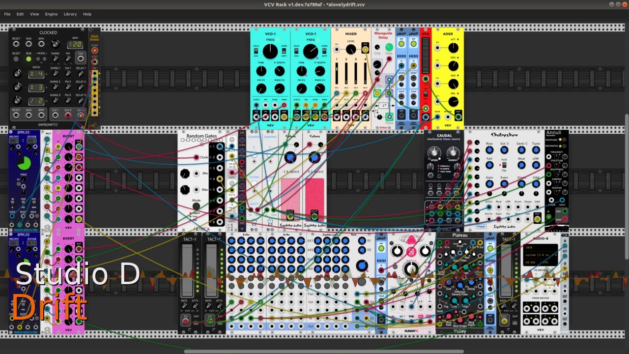 Two mscHack Dronez modules deliver a drone + melody, with assistance from a pair of Annuli resonators, Seq++, and friends from the regular supporting crew.
