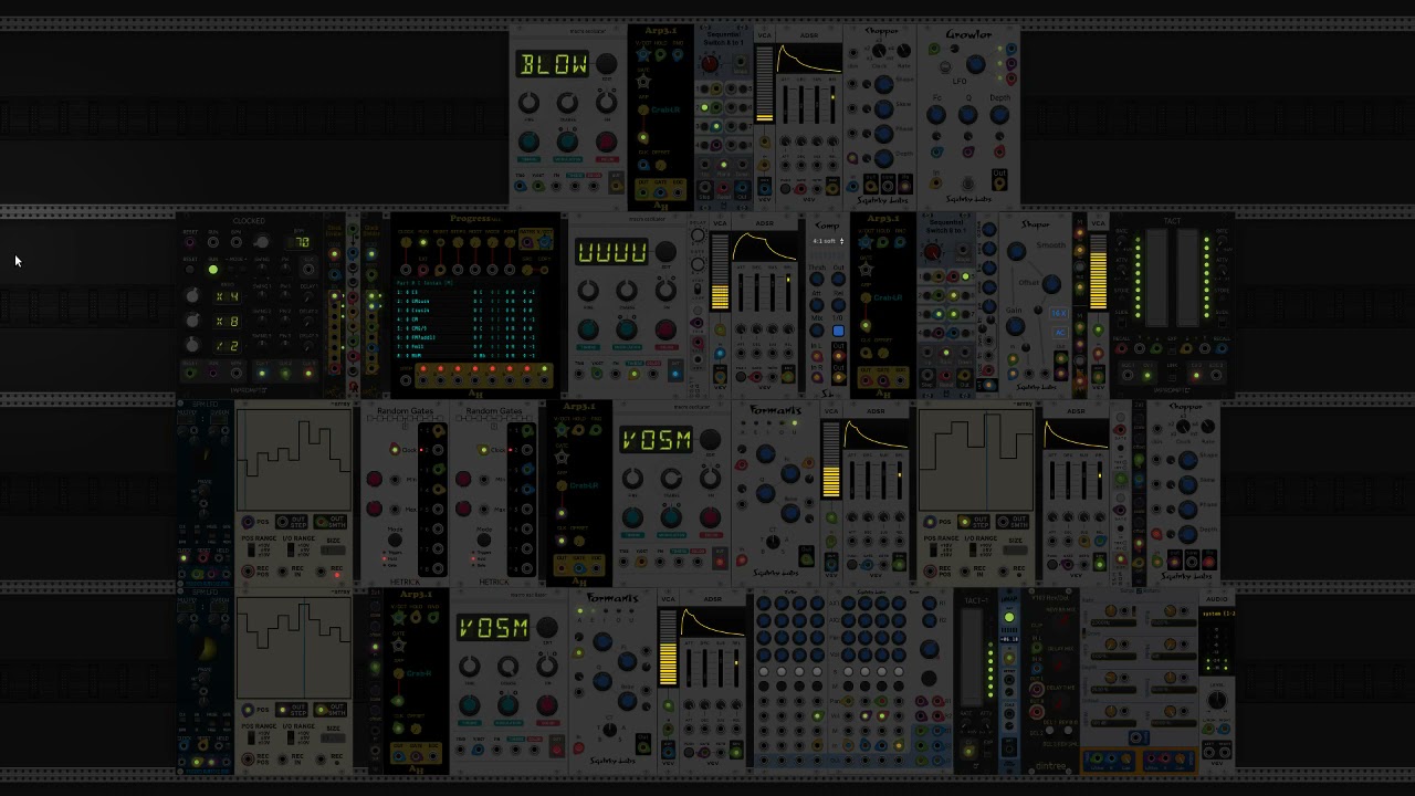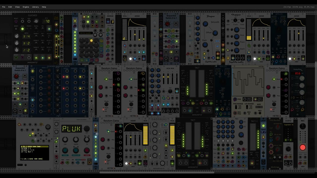 The patch for VCV Rack 2 can be found at Benestabene | Patchstorage. It uses only freely available plugins, but not all are available from the official Library. Specifically, it requires the virtual Monome plugin (GitHub - Dewb/monome-rack: VCV Rack plugin for monome Eurorack modules) and a polyphonic version of the Braids Macro Oscillator (a custom build based on code from GitHub - Xenakios/Poly_AudibleInstruments). Alpha-stage releases of the virtual Monome plugin can be found at Releases · Dewb/monome-rack · GitHub. The polyphonic Macro Oscillator can be replaced by multiple instances of the Audible Instruments Macro Oscillator, though you will need to study the original settings and connections for the polyphonic version in the screenshots (see below).