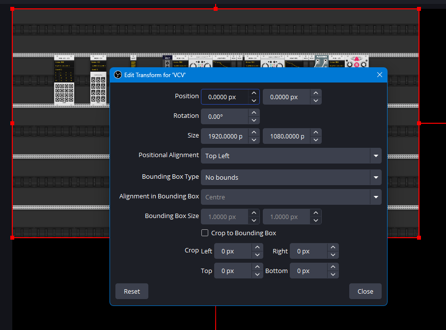 So now to check that everything is correct, I drag my VCV Rack window to my FancyZone to size it, then in OBS I reset the sources transform, and then I can check its dimensions in the Edit Transform... dialog