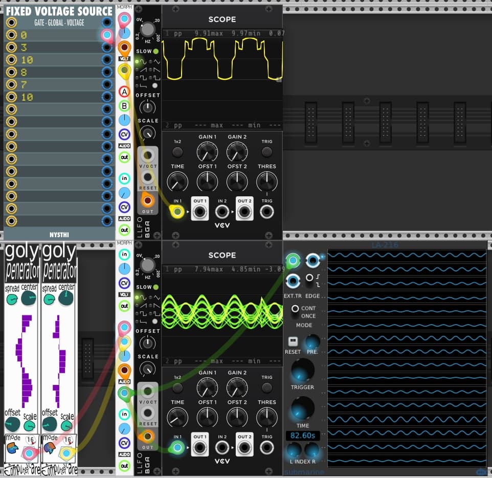 Morph by JohannAsbjoernson/JA (on GitHub: GitHub - JohannAsbjoernson/JA) can crossfade between the channels of a polyphonic signal (module top and bottom sections). Alternatively, it can crossfade each channel between two polyphonic signals (module mid section). Has a switch to adjust the voltage range (either -5/5V or -10/10V).