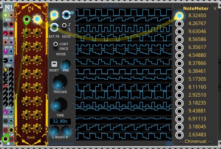 Seed (T) generates a polyphonic signal of 16 seeded ‘random’ values. The outputs are directly dependent on the Seed input port, i.e. feeding it a specific seed (monophonic) value always creates the same set of 16 ‘random’ values.