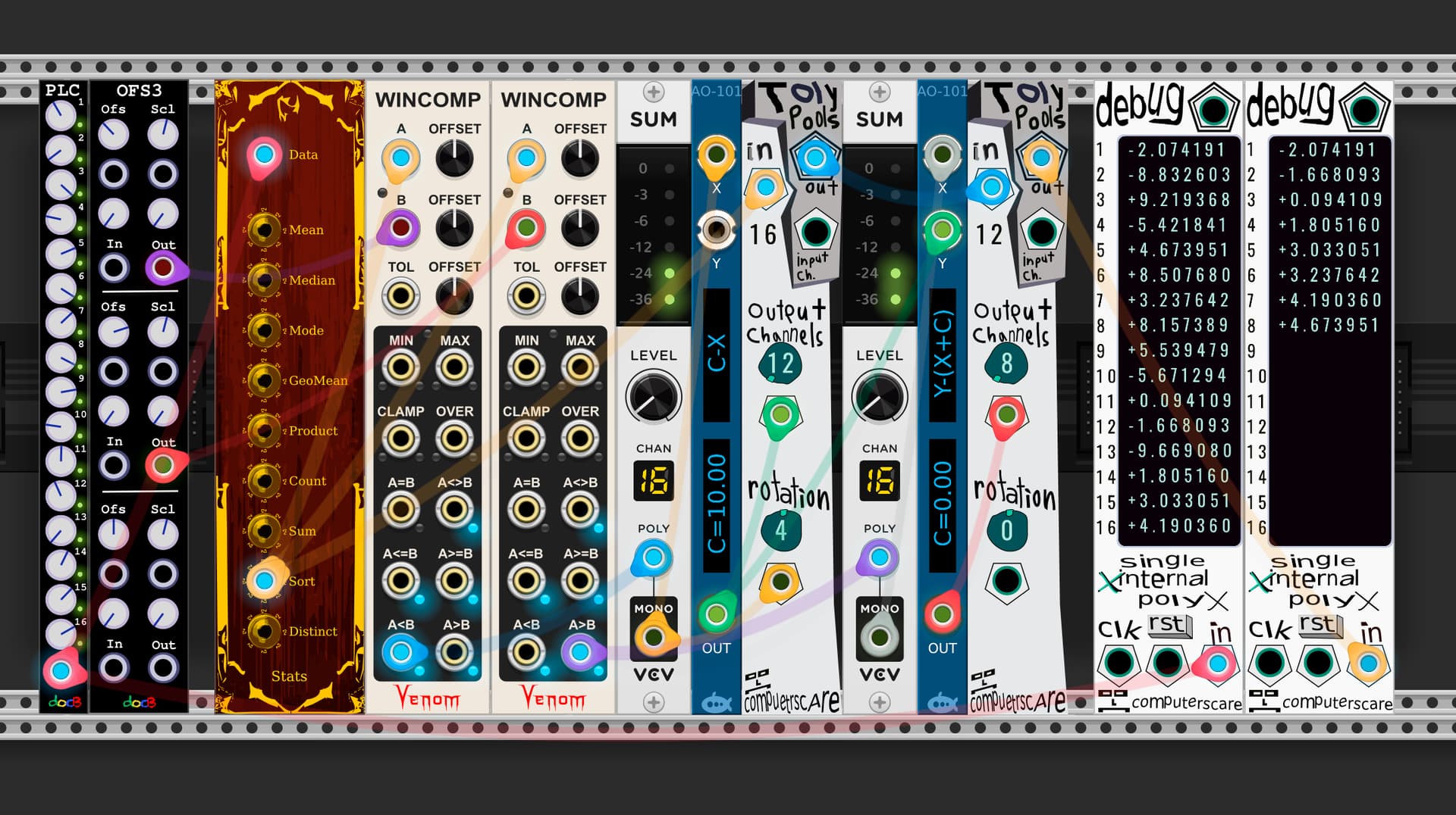 The collection also includes a drone sequencer, a set of 4 N1 Sequencers, Split and Merge, a polyphonic comparator that can be used as a frequency splitter, a 16 channel version of clocked random gates and some other obscure utilities.