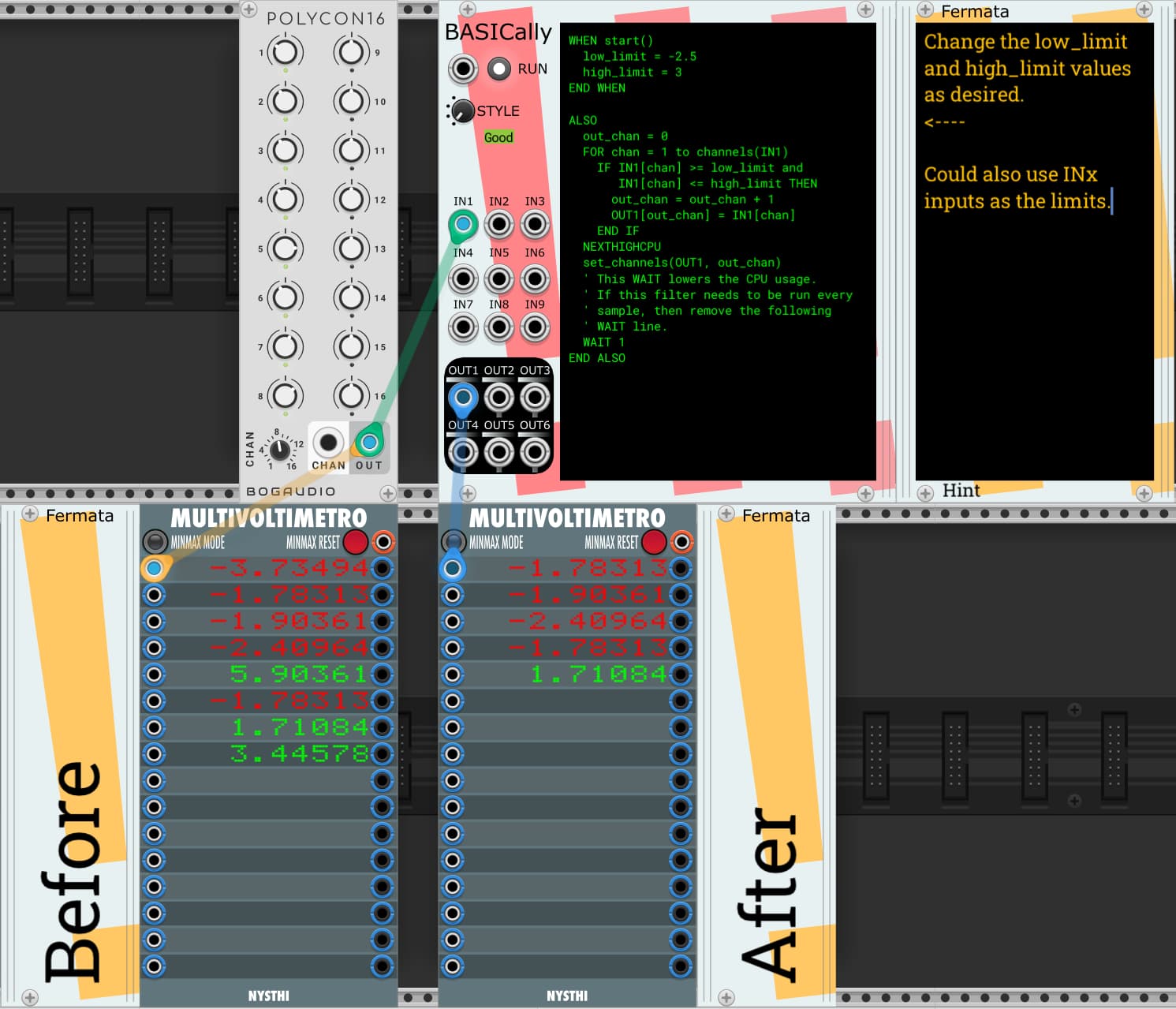 Specifically, I want to take a 16-channel poly signal with a wide voltage range and output an N-channel poly signal that filters out any channels whose voltages fall above or below a user-defined range, while passing the remaining channel values through unchanged.