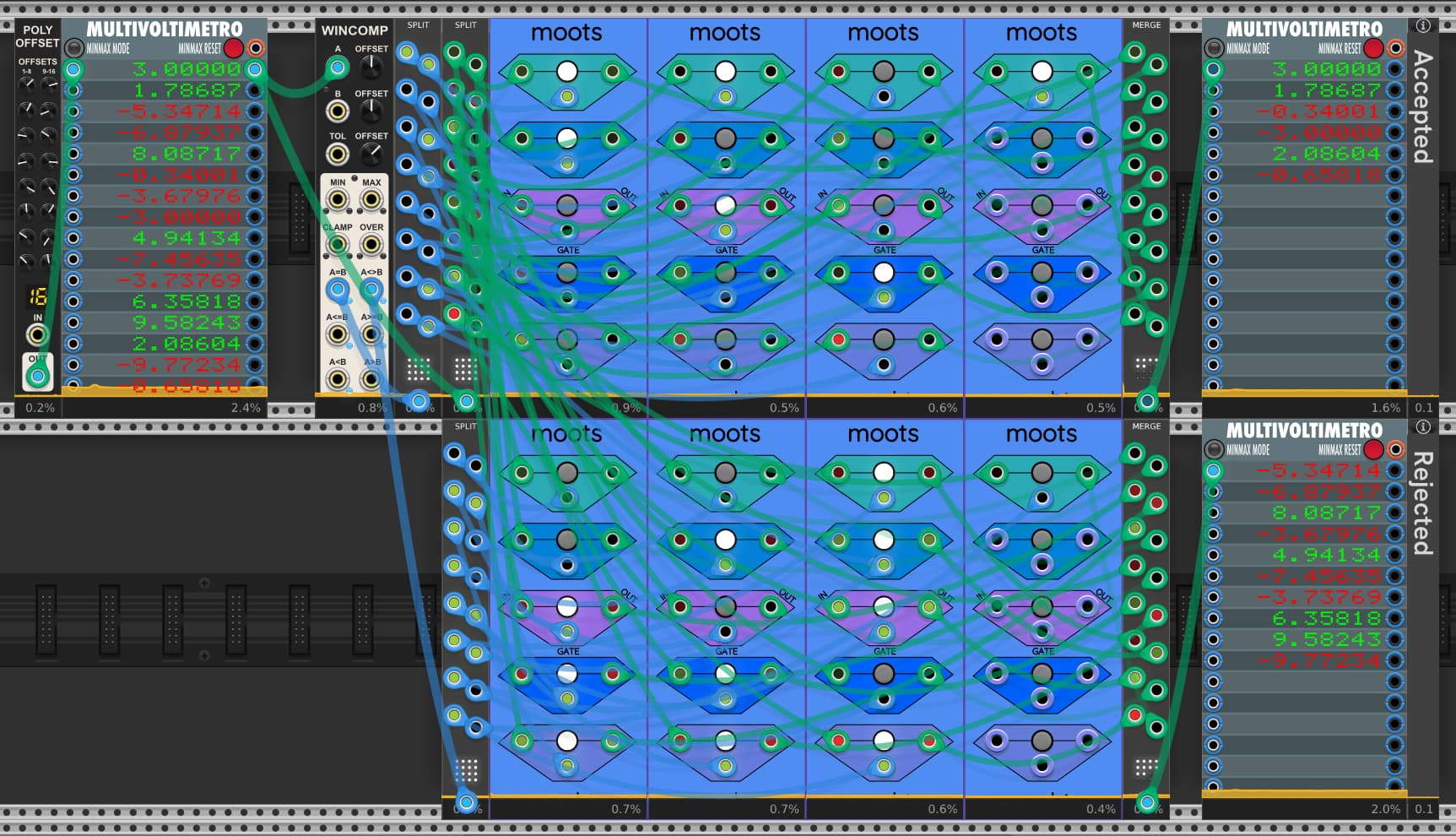 Pretty much any polyphonic windowed comparator and poly split can be used. The critical components are the Sapphire MOOTS that can nullify cables (give the channel 0 channels as if the cable is not there), and the Sulasmith Polyphonic Merge that ignores unpatched mono inputs. Every other merge module I am aware of preserves unpatched input channels below the highest channel that is patched.