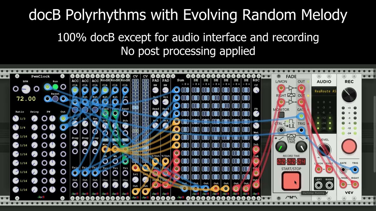 I decided to restrict my patch to only using docB (apart from the audio interface, recorder, and FADE to start/stop with fade out). Rather than use any of the fancy sequencers, I opted to build my patch with primitive building blocks.