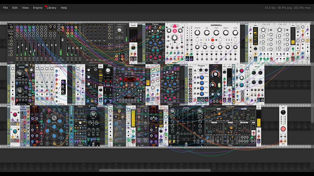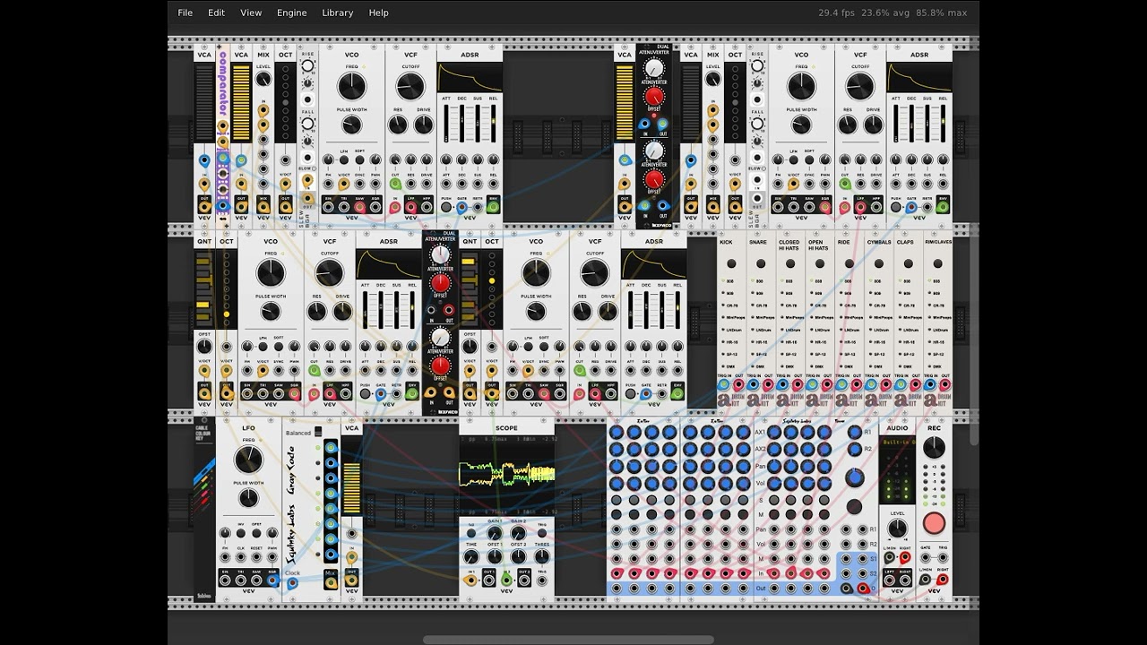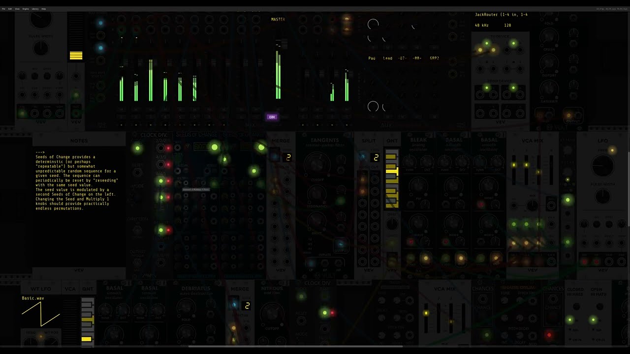 My first entry is totally uncontrolled chaos. In stark contrast, this one has a tightly controlled melodic structure, but of course without any sequencers. The first voice is basically an arpeggio, but I felt that an arpeggiator is too much like a sequencer, so I constructed my own arpeggiator out of more primitive modules. Some variant of this design will be part of my next set of VCV Fundamental Constructs, when I finally get around to updating it.