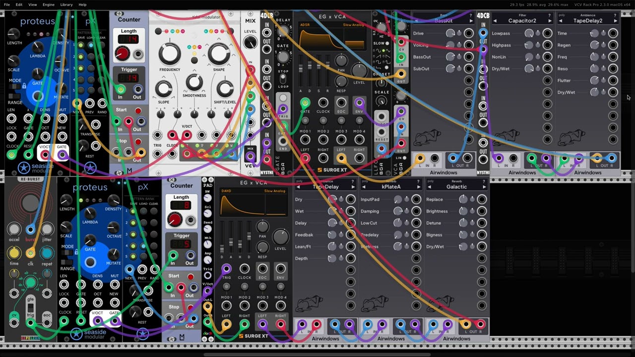 My patch uses 81 Airwindows, and absolutely nothing else besides the Audio module. Almost half the modules are for a 4 channel stereo mixer with 2 Send and Return effects loops.