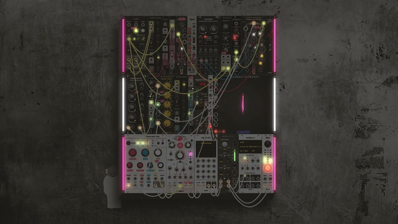 Proteus provides the autogenerative driving "melodies’ at 40 and 10 BPM, and six Bogaudio Walk modules modulate the FM depths, left and right FM levels, and filter cutoff and resonance. Lastly a third clock runs through Venom Bernoulli Switch in Bernoulli Gate configuration to randomly trigger the VCA. Really pretty simple. Oh yeah, some Dawesome Love FX to add some additional magic.