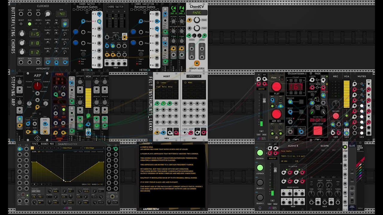 A piano (Felt Instruments LEKKO) plays arpeggios that butterfly around two chords. The chords variate slightly themselves and together create generative pitch classes quite elegantly.