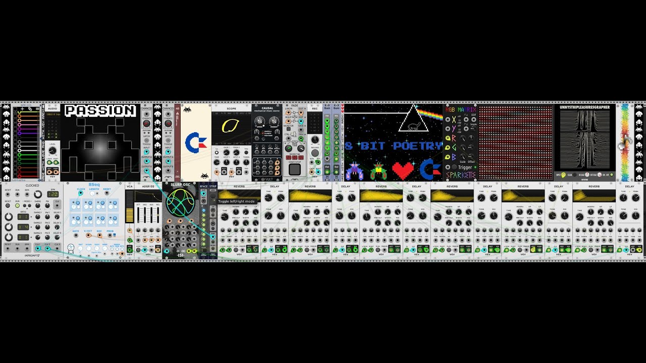 Well, I really don’t know if it is “very cool” but I like it. I realized only after I uploaded it that you might want to change retail Caudal with free Caudal (it does change nothing in the patch) and you might want to download my Chiptune blank plugin (just for the aesthetic). The rest is absolutely trivial: one VCO driven by a sequencer; the output is fìltered by 6 reverb and 6 delay, each one of them has a state memorized in støermelder 8face each of those state is randomly selected by a Bernoulli gate and slapped on by a strip module. Seriously, nothing fancy here.