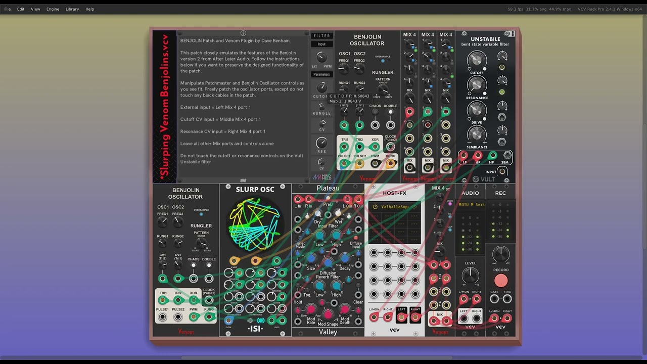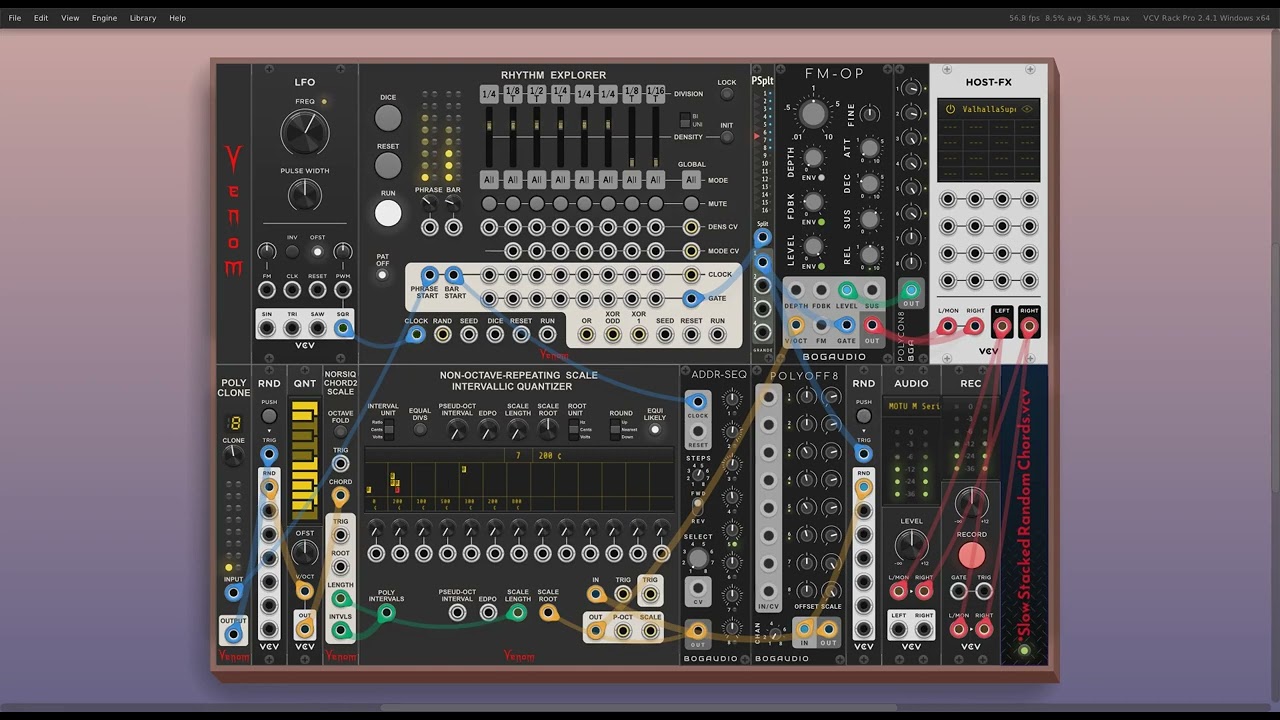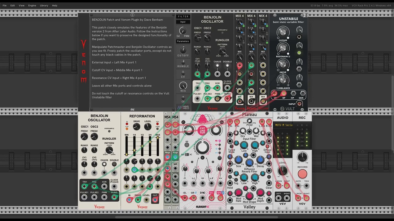 This is my favorite of the new modules. I already had a good emulation of the Benjolin using pre-existing modules, and it sounds great. But my emulator was unable to control aliasing introduced by the Rungler. This was typically not an issue, but aliasing would crop up when clocking the Rungler at high frequencies. This new Venom module allows me to oversample the Rungler timing and thus get anti-aliased Rungler and XOR outputs. So now all outputs can have anti-aliasing, allowing the oscillator to create sweet sounds even at extreme frequencies. (No worries - it still can create harsh sounds as well, just as it should!)
