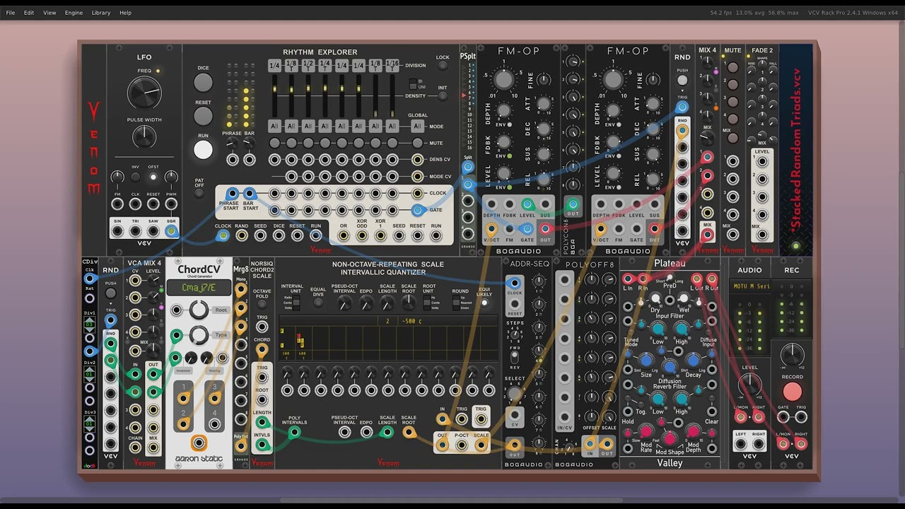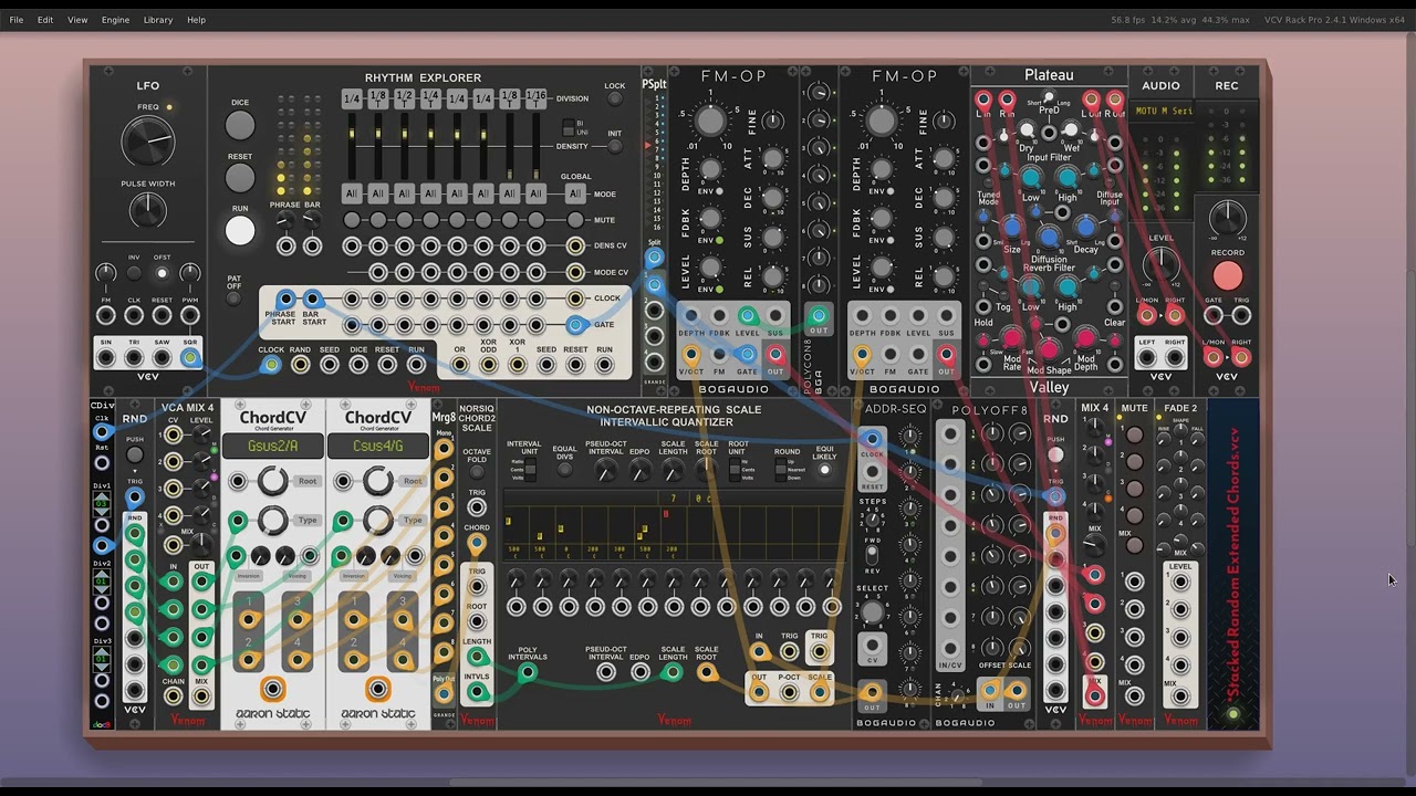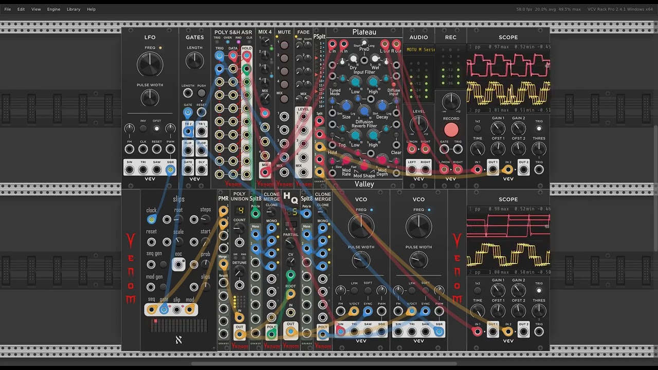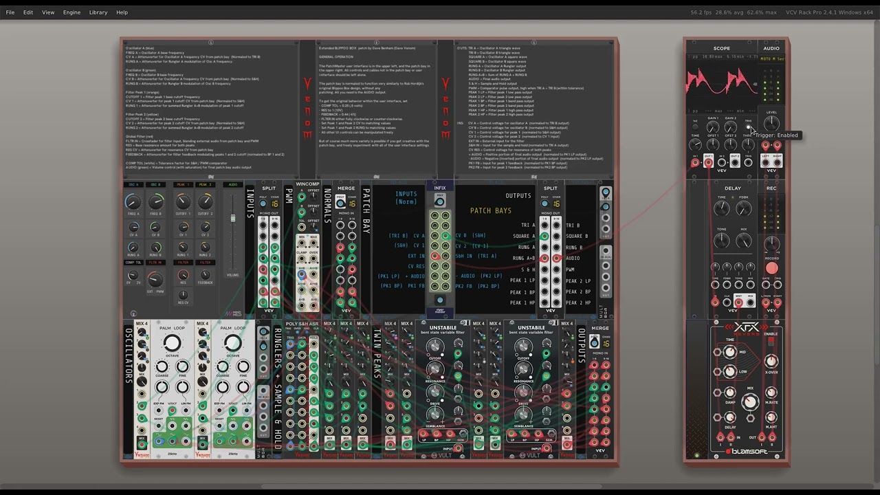 This is my favorite of the new modules. I already had a good emulation of the Benjolin using pre-existing modules, and it sounds great. But my emulator was unable to control aliasing introduced by the Rungler. This was typically not an issue, but aliasing would crop up when clocking the Rungler at high frequencies. This new Venom module allows me to oversample the Rungler timing and thus get anti-aliased Rungler and XOR outputs. So now all outputs can have anti-aliasing, allowing the oscillator to create sweet sounds even at extreme frequencies. (No worries - it still can create harsh sounds as well, just as it should!)