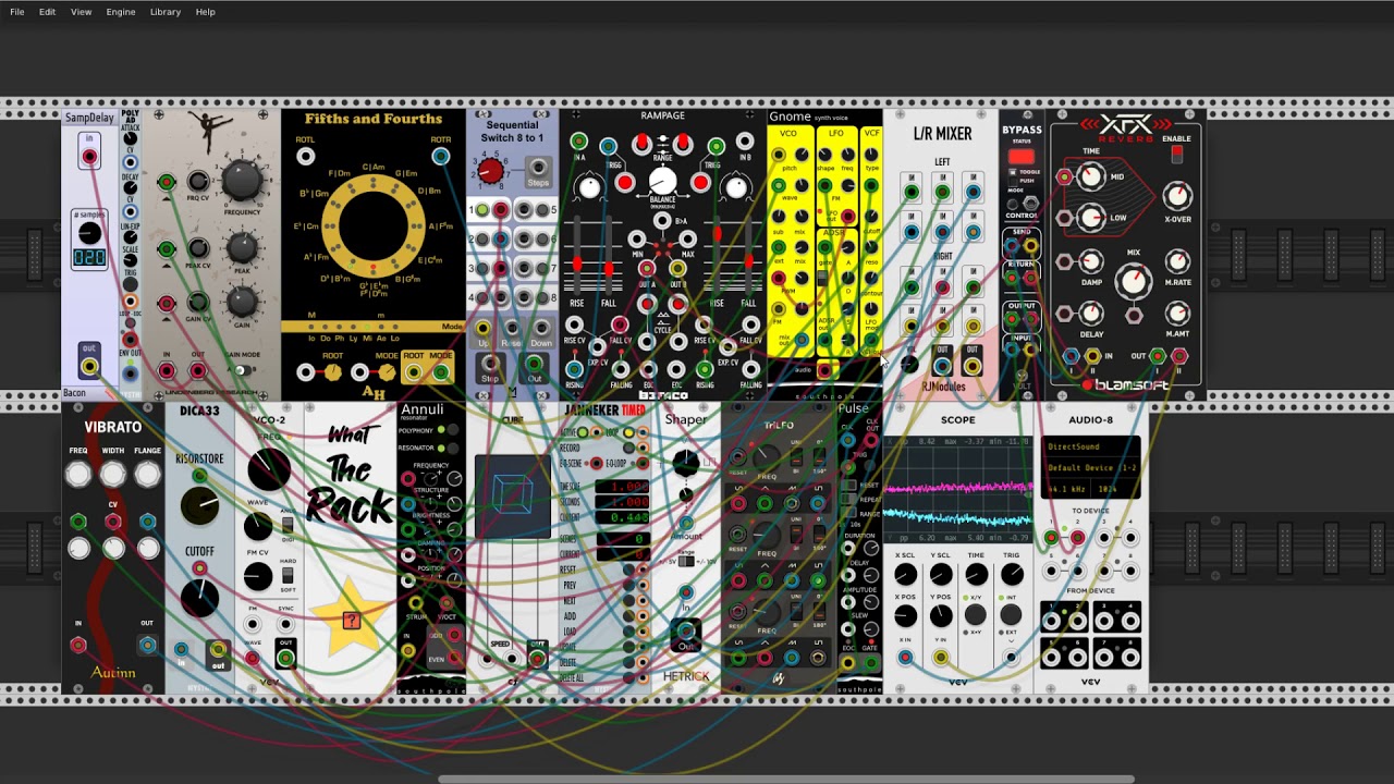 As I said upthread, this was hard to do. I think What the Rack picks modules in a ratio that I just wouldn’t use. Two oscilators and several filters just seems like a weird choice. Upsides included learning some modules that I didn’t really know about (the best thing about VCP for me) and learning that you can put a mono audio signal into Vult Spank with a poly gate and you get a poly audio out. I learnt Elsker and that dBiz clock divider but didn’t really figure out what Autinn Mera does. I did plug it in though, just to say that I’d done it. I used RJ modules Range to give some fine control to the coirt LFO, which I used as a clock. I only added two modules, RCM reverb and MuxDeMux which I had tried earlier and could easily become a staple.