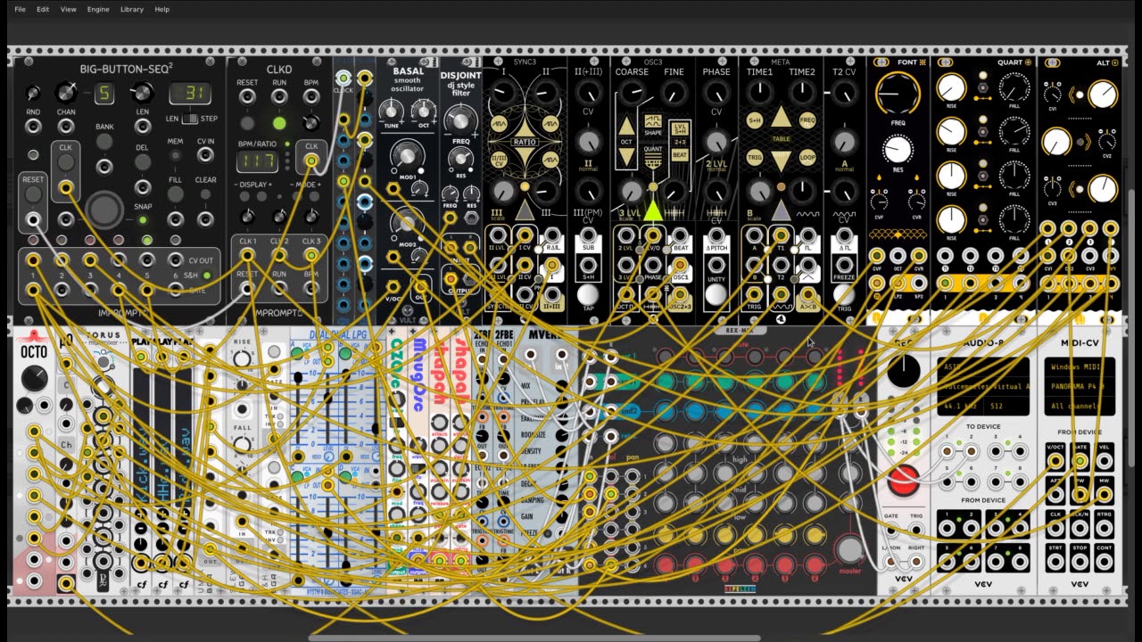 make a "fixed rack" as if you were limited by hardware choices, as in physical eurorack. common dimensions (which we did in vcp challenge 32) are 9u (= 3 rows) by 104hp. but you are free to choose other dimensions. aim for it fitting on a screen without too much zooming or scrolling. use only free modules. cables not needed for the fixed rack submission patch.