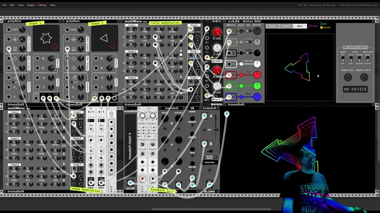 i can’t necessarily speak to the viability of larger scale video/gfx generation, but it’s certainly possible to draw pretty much whatever you want with enough work. for my module ‘turnt’, a fellow dev helped me out and created a custom ‘scope’ widget that i could draw on my module to display the input signal(s), just like any other regular ‘scope’ module does. and there are a number of other modules out there from other devs that focus more directly on more ‘generative’ visualizations and all that. so it’s definitely possible to get pretty creative in that way, but again i can’t really speak to the larger question of overall bigger-scale viability and stuff since i haven’t really done much of it myself.