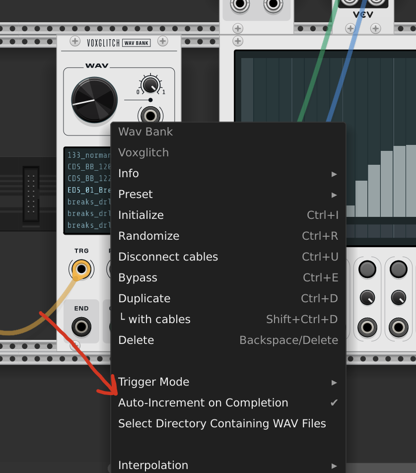 I had some extra time tonight, so I implemented your second request. In WavBank, there’s now a context menu option to auto-increment the selected sample once the current sample has completed playback. This happens only if there’s no cable attached to the WAV CV input.