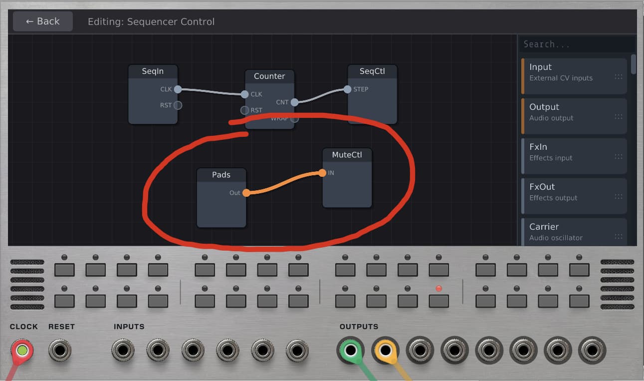 The sequencer control patch will have the Pads module wired to the MuteCtl module by default: