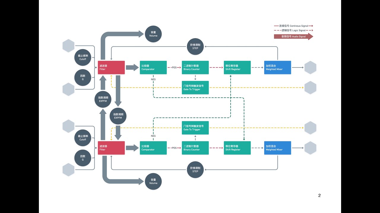 With multiple feedback and cross modulation paths, Wing Pinger operates according to the principles of chaos theory. All parameters except volume are interactive, future outputs are related to the current state as well as parameter settings.